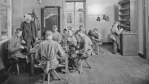 Elever i værkstedet på Det Kongelige Blindeinstitut på Østerbro i København, 1904. Foto: Lars Peter Elfelt/Det Kgl. Biblioteks billedsamling.